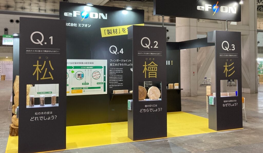 企画イベント 【制作物】 ブース装飾 【仕 様】 2小間(6m×3m) 昨年に続き 環境総合展示会 エコプロ2025 ブース装飾企画、デザイン製作、施工いたしました。 林業の製材工程を分かりやすく伝える教育的展示として小学生高学年をメインターゲットにしつつ、黒ベースでシンプルかつ目立つデザインとしました。 クイズを解くことを目的とした導線で、多くの方に来場いただきました。